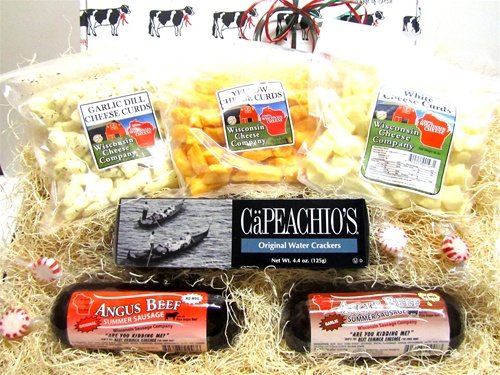 Ultimate Cheese Curd, This ultimate box includes: ? Cheese Curds- Yellow (12 oz) ? Cheese Curds- White (12 oz) ? Cheese Curds- Dill (12 oz) ? Summer Sausage - Angus Beef, Original (12 oz) ? Summer Sausage - Angus Beef, Garlic (12 oz) ? Crackers - Capeachio's Original Water Crackers (4.4 oz) All in our authentic cow gift box!